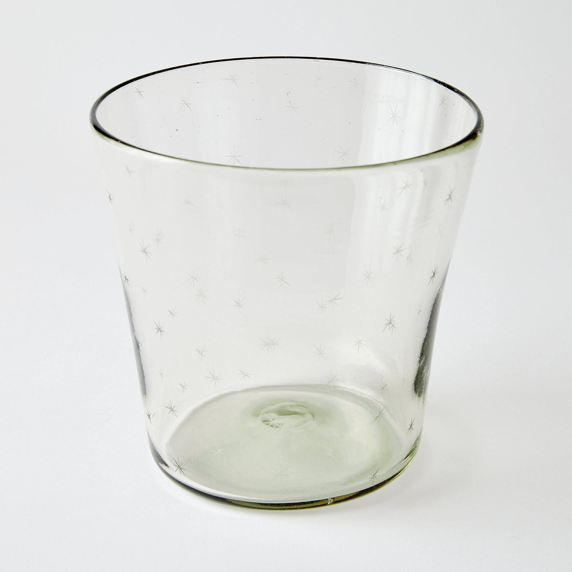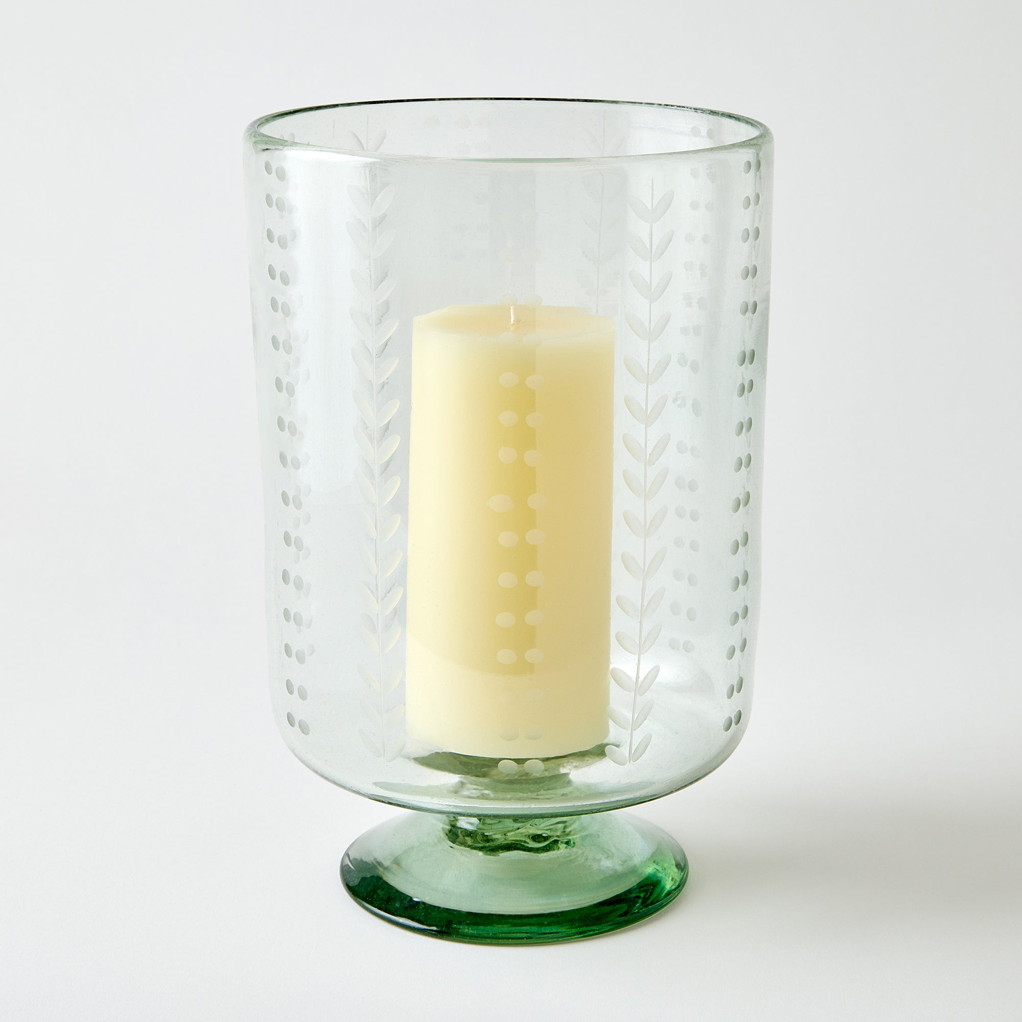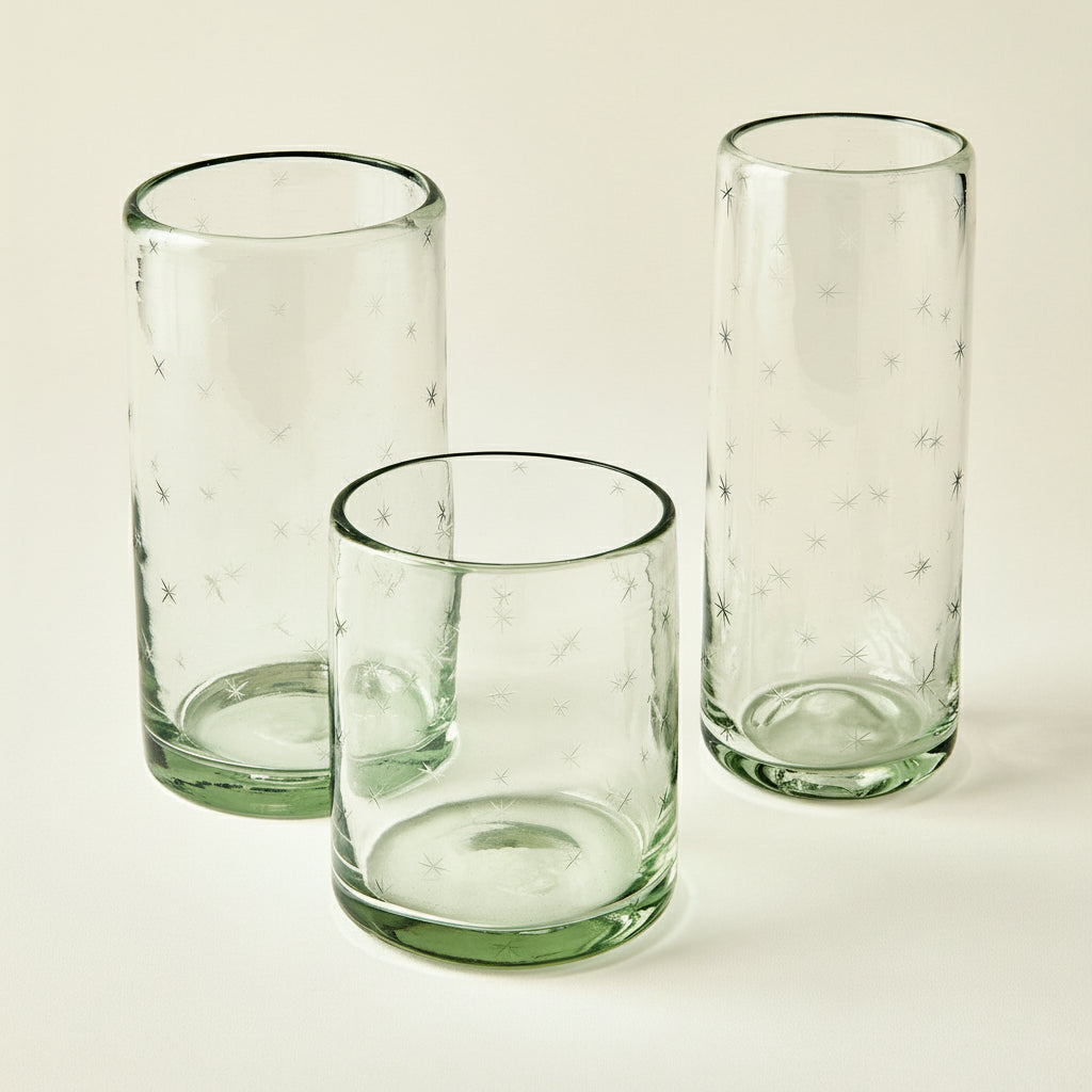 Clear glass etched with ferns and dots filled with champagne on a light gray background