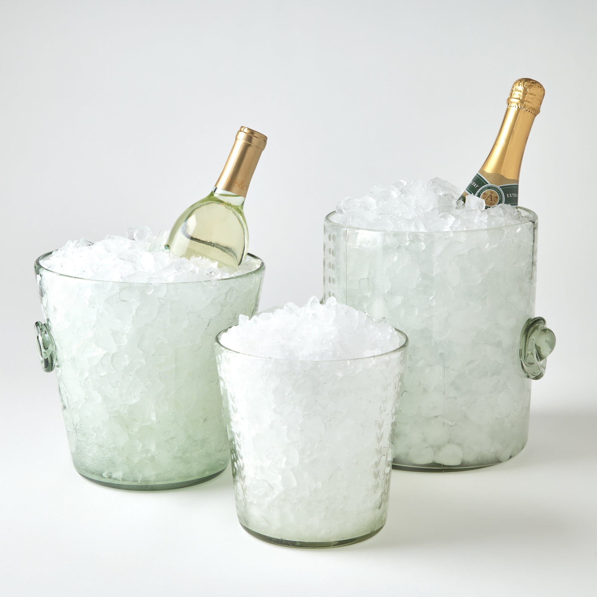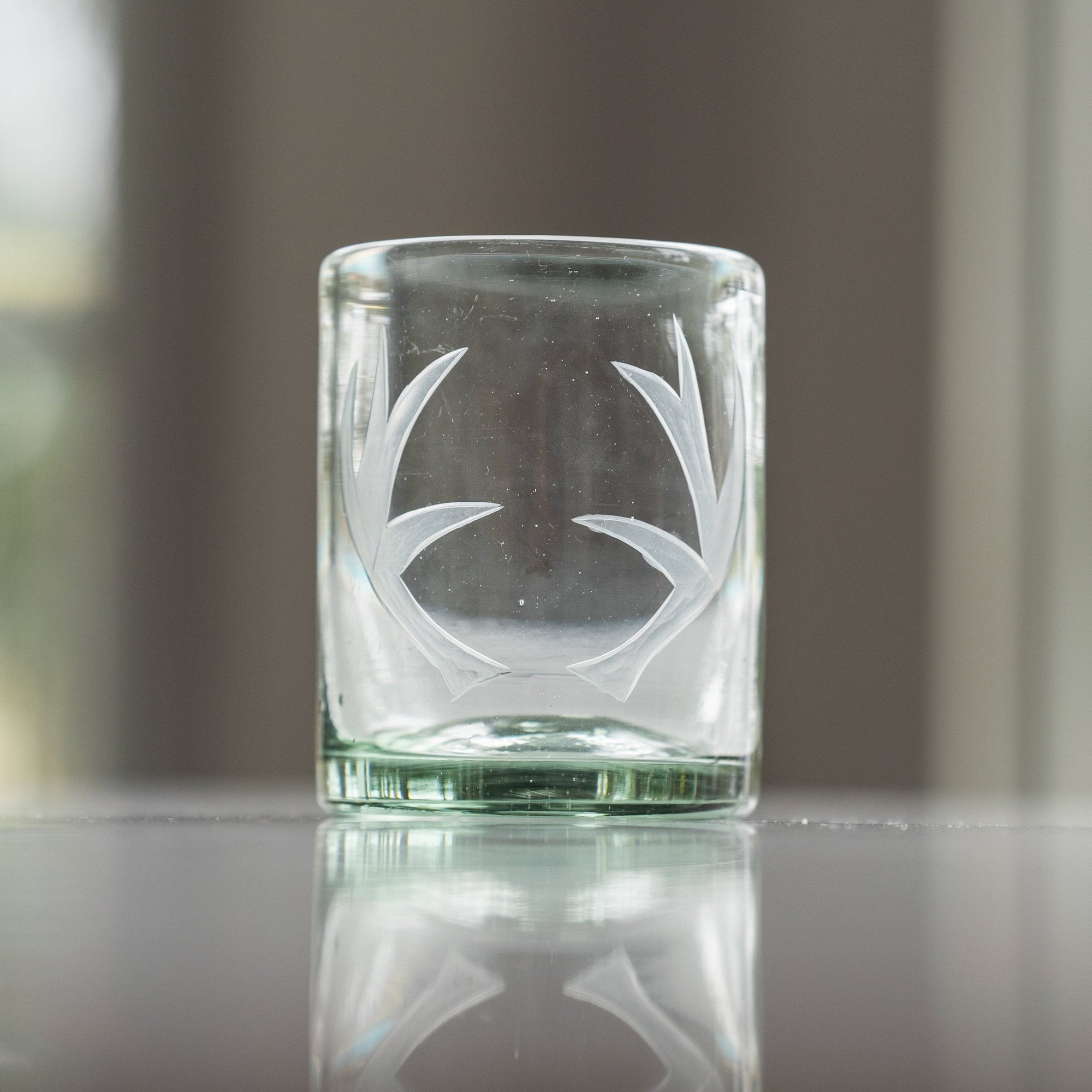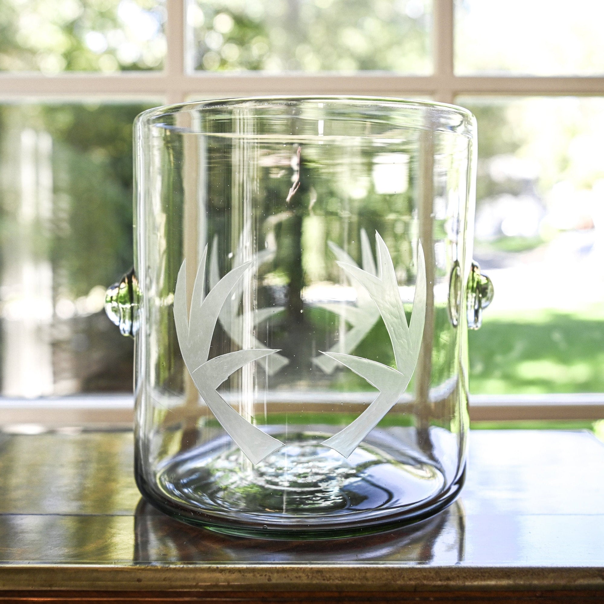 Clear glass etched with ferns and dots filled with champagne on a light gray background