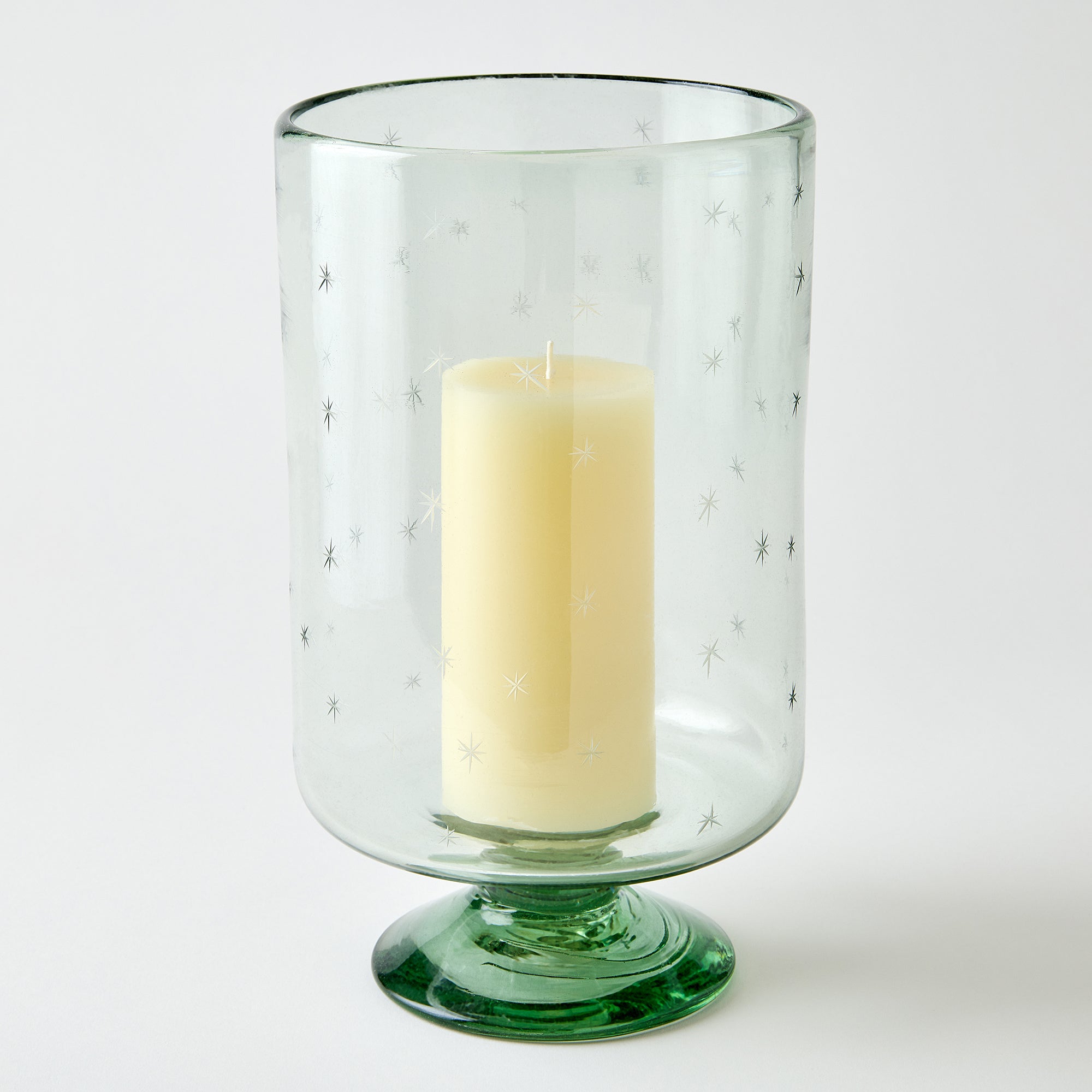 Decorative glass candle holder with a lit candle on a plain background